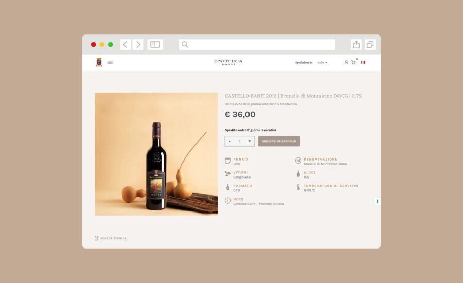 El objetivo principal de enotecabanfi.it Significa ofrecer a los amantes del buen vino un acceso fácil y privilegiado a la amplia gama de finos vinos Banfi. Aprovechando la tecnología de la plataforma de e-commerce Wineplatform, hemos transformado el comercio electrónico de Banfi en un punto de referencia para los amantes del vino, con un escaparate digital completo organizado en cinco categorías distintas: Castello Banfi, Banfi Toscana, Banfi Piemonte, Vecchie Vannate y Ricercatezze.