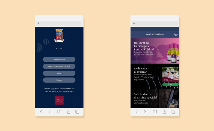 Nuestros muchos años de colaboración con Banfi nos han permitido trabajar en aspectos clave de la nueva tienda digital. También se puede acceder al nuevo comercio electrónico desde numerosos puntos de contacto, para crear un ecosistema de compras digitales de 360°. De hecho, es posible acceder desde el sitio banfi.it, de sitios de marcas de empresas individuales como lapettegolabanfi.it, además de la aplicación Banfi Experience, también desarrollada por Publifarm. Por último, incluso aquellos que llevan consigo una botella de vino Banfi pueden acceder enotecabanfi.it, enmarcando el código QR en la etiqueta.